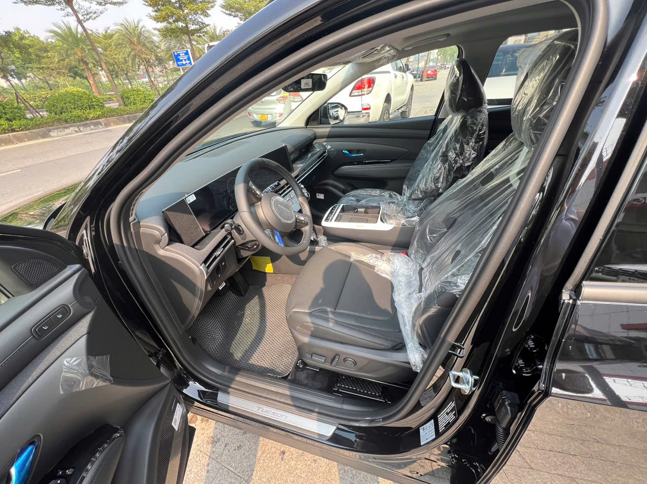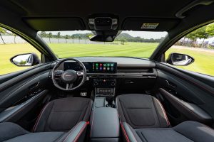 Điểm nhấn của không gian nội thất của New Tucson là cụm 2 màn hình thông tin và màn hình giải trí có kích thước 12.3 inch mỗi màn được nối liền mạch với độ nghiêng vừa phải hướng về người lái. Phong cách thiết kế này tương đồng với All New Santa Fe mới được ra mắt gần đây. Màn hình này hỗ trợ Android Auto/Apple Carplay không dây. Xe được trang bị hệ thống đèn LED nội thất, có thể điều chỉnh 64 màu giúp làm tăng thêm tính thẩm mĩ cho không gian.